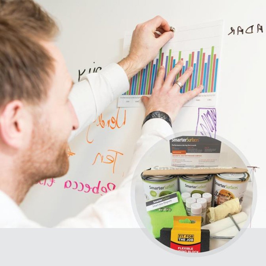 בניגוד ללוחות מחיקים רגילים, באמצעות צבע לוח מחיק מגנטי חכם של סמארטר סורפסז תוכל ליצור משטח עבודה בלתי מוגבל באיזה גודל שתרצה. תוכל להפוך קירות שלמים למשטחי כתיבה מגנטים וליצור בכך מרחב עבודה אינסופי.